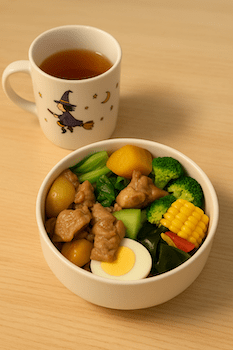 🥗 摘要:這份午餐以「栗子燒雞+紫米飯」為主,兼具高蛋白與豐富纖維,整體升糖緩慢、油鹽控制良好。若能做到「澱粉擇一(地瓜或玉米)」與「瀝掉醬汁」,更能完美兼顧血糖、血壓、肝腎與血脂健康。