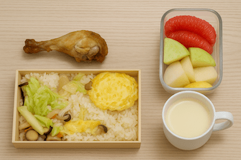- 主餐:炸雞腿(去皮)、炒高麗菜與菇類、煎蛋 1 份、白飯 1/4 碗