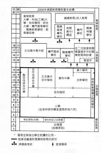 德國的教育體系為12至13年義務教育,大致上為初中等教育的階段,實際上教育體制因邦而異。學前教育端賴家長的意願,可將兒童送往托兒所,純屬非強迫性。小學階段除了少數邦為6年(如柏林)之外,其餘為4年。在中等教育階段,德國主要採行的制度為”一本三枝”,在晉升至中學階段期間,存有一為期兩年的定向階段(Orientierungsstufe),藉此可以透過老師的建議以及學生與家長的意願,決定往後就讀的學校。中等教育主要有三種學校可供選擇,依次為主幹學校(Hauptschule)、實科中學(Realschule)以及文法高中(Gymnasium)。學業程度較好的學生通常選擇文法高中就讀,為期約九年,乃進入高等教育必經之路,學生以升大學為主要出路,政府領導階層、社會精英多半出自於此。資料來源